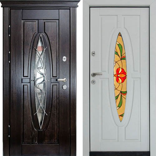 Металлическая парадная дверь из массива дуба со стеклом, ковкой и витражом — объединяет современный дизайн и превосходные защитные характеристики.